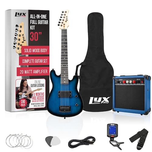 LyxPro Guitarra elétrica de 76 cm e kit de iniciante para crianças com guitarra para iniciantes de tamanho 3/4, amplificador, seis cordas, duas palhetas, alça de ombro, afinador de clipe digital, cabo - Conjunto de guitarra para iniciantes para meninos e meninas | O pacote definitivo para iniciantes inclui guitarra infantil 3/4 e todas as peças e equipamentos de que precisam para arrasar direto da caixa | Escolha perfeita para jogadores iniciantes e intermediários de 9 a 12 anos - GUITARRA ELÉTRICA REAL DE 76 POLEGADAS | A guitarra plug-in possui a mesma escala e materiais de alta qualidade que um instrumento de tamanho completo para adultos, incluindo escala de jacarandá premium, pescoço de bordo canadense, botões de volume/tom e muito mais - Amplificador de 20 watts com cabo | O pacote inclui amplificador de 20 W com alto-falante embutido, entrada de fone de ouvido e entrada auxiliar para reproduzir música no telefone ou MP3 Player | Controles integrados incluem ganho, graves, agudos, volume e moagem - SINTONADOR DIGITAL E ACESSÓRIOS | Mini afinador de encaixe operado por bateria e livro de instruções ensina as crianças a afinar sua guitarra para melhor qualidade de som | O kit também vem com [6] cordas, [2] palhetas e alça de ombro confortável - Dê o presente de uma linda música | O conjunto multifuncional para manequins é o sonho de um músico iniciante | Da casa à escola e às aulas, aprender violão nunca foi tão fácil! | Presente perfeito para Natal, aniversário e muito mais