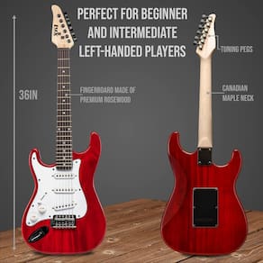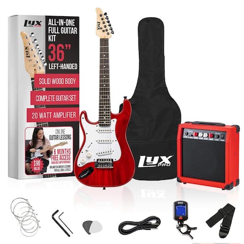 LyxPro Guitarra elétrica canhota de 91 cm e kit para crianças canhotas com guitarra iniciante tamanho 3/4, amplificador, seis cordas, duas palhetas, alça de ombro, afinador de clipe digital, cabo e - GUITARRA ELÉTRICA ESQUERDA DE 91 cm REAL | Guitarra Plug In apresenta a mesma escala e materiais de alta qualidade que um instrumento de tamanho completo de um adulto, incluindo o fingerboard de jacarandá premium, gola canadense de bordo, botões de volume/tom e muito mais - Conjunto de guitarra para iniciantes canhotos para meninos e adolescentes | O pacote Ultimate Starter inclui guitarra 3/4 de tamanho infantil e adolescente e todas as peças e equipamentos que eles precisam para arrasar direto da caixa | Escolha perfeita para jogadores iniciantes e intermediários - Amplificador de 20 watts com cabo | O pacote inclui amplificador de 20 W com alto-falante embutido, entrada de fone de ouvido e entrada auxiliar para tocar junto com música no telefone ou leitor de MP3 | Controles integrados incluem ganho, graves, agudos, volume e moagem - Afinador digital e acessórios | Mini sintonizador de clipe operado por bateria e livro de instruções ensina as crianças a afinar sua guitarra para melhor qualidade de som | O kit também vem com [6] cordas, [2] palhetas e alça de ombro confortável - Dê o presente de uma bela música | O conjunto multifuncional para leigos é o sonho de um músico em ascensão | De casa à escola às aulas, aprender guitarra nunca foi tão fácil! | Presente perfeito para o Natal, aniversário e muito mais - 100% de satisfação do cliente GARANTIDA que apoiamos nossos produtos e nos orgulhamos de atendimento ao cliente excepcional