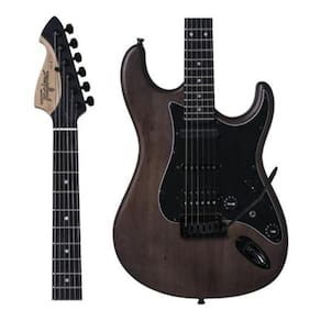 - Juninho Afram Signature - Corpo: Alder - Braço: Maple - Shape C - Escala: Rosewood com 22 trastes e marcações em acrílico; - NUT: Osso 43mm - Captadores: 1 mini Humbucker com imã cerâmico no braço, 1 single no meio e 1 humbucker na ponte com imã alnico; - Controles: 1 Chave seletora de 5 posições, 1 Volume, 1 Tonalidade e 1 Chave microswitch split para o captador da ponte - Ponte: Tremolo com 2 pivôs - Tarraxas: Pretas e blindadas Diecast - Cor: Transparent brown - Escudo: Black - Versão para canhotos Não Ean: 7898563977982
