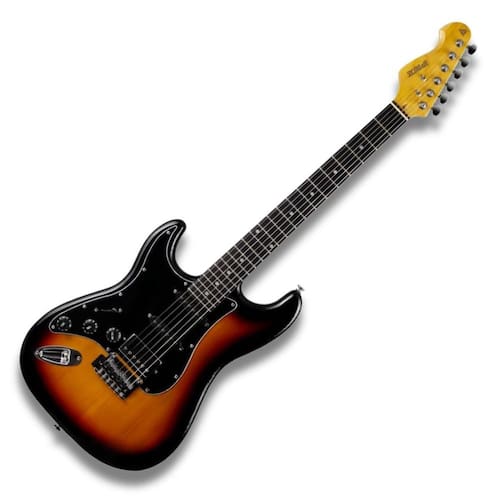 Linha sunset Corpo: Alder Braço: Maple Escala: Techwood Ponte: 2 pivôs Captador: 2 single coil e 1 humbucker - Alnico 5 Tarraxas: Cromadas com trava Acabamento: Verniz Brilhante Controle: 1 volume/ 2 tones/ chave 5 posições