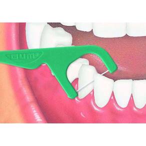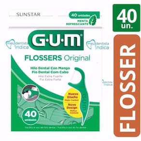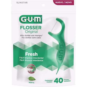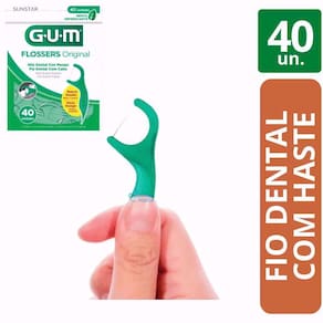 Flosser com fita dental sabor menta que limpa profundamente entre os dentes, removendo a placa e restos de comida.O Fio Dental Gum Flossers é uma haste com fio dental em sabor de menta refrescante, ideal para uso rápido e conveniente para o dia a dia, possibilitando o cuidado em qualquer momento desejado. O que éO Fio Dental Gum Flossers auxilia a limpeza interdental para cuidar dos espaços que as escovas comuns não conseguem alcançar, garantindo a eliminação da placa bacteriana e detritos de alimentos entre os seus dentes. Eficaz na limpeza interdental, prático e descartável.Para que servePermite alcançar lugares de difícil acesso, sendo mais fácil e prático de usar que o fio dental, além de prevenir cáries e evitar inflamação das gengivas. Sabor de menta refrescante.Modo de usarUtilize sempre após a escovação.