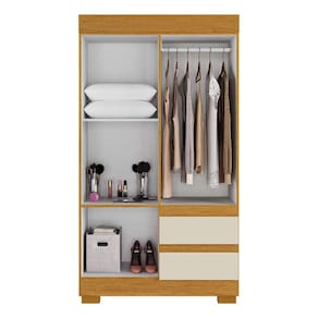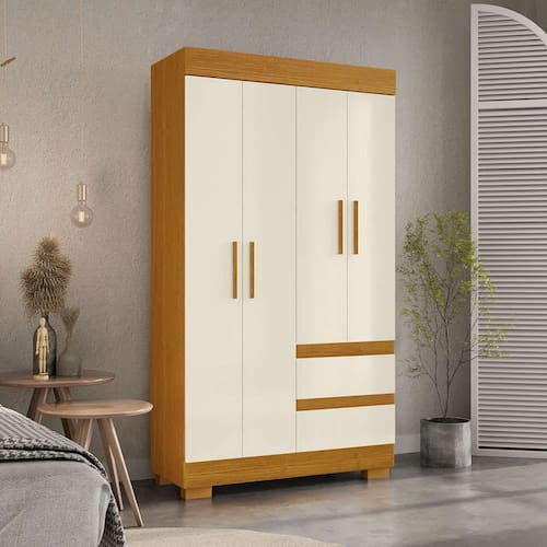 que tal o guarda-roupa maya? com o guarda-roupa maya você leva o aliado perfeito para seu dormitório completo e organizado. além de ter 4 portas e 2 gavetas para te ajudar na organização de itens do dia a dia, o móvel traz um visual sóbrio e atemporal, destacando a coloração elegante e os puxadores alongados em mdf. ah, notou que o espaço interno é na cor linho? um grande diferencial para dar aquele toque extra de charme ao seu quarto dos sonhos ;) Marca: Modern