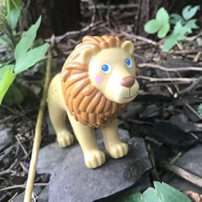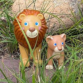 "Rugido!" Aí vem o leão selvagem, orgulhosamente sacudindo sua magnífica jurhísula. Os Amiguinhos gostam de ver o leão sendo alimentado e compartilhando sua comida com o orgulho.