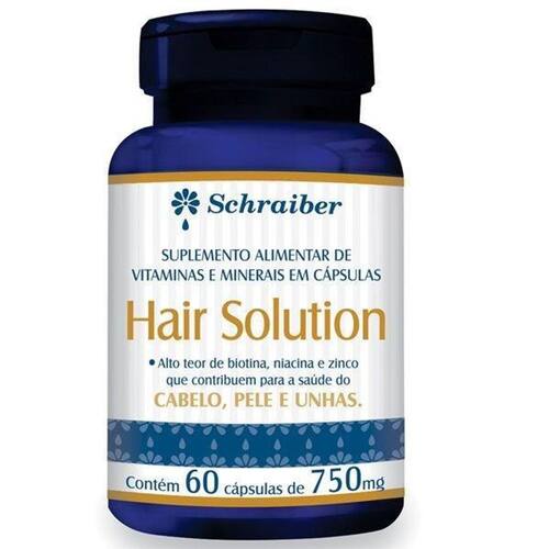Hair Solution 750mg 60 cápsulas Schraiber Descrição:x005fx005fx005fx000d x005fx005fx005fx000d O Suplemento alimentar de vitaminas e minerais em cápsulas Schraiber tem alto teor de biotina, niacina e zinco; nutrientes essenciais às células do bulbo capilar que contribuem para a manutenção dos cabelos, unhas e pele saudáveis. As vitaminas presentes em sua formulação contribuem para a realização correta da síntese dos aminoácidos com um eficaz complexo antioxidante vitaminas C e E, Selênio e Zinco que ajudam a proteger as células contra o stress oxidativo.x005fx005fx005fx000d x005fx005fx005fx000d Ele age de dentro para fora, nutrindo os fios, fortalecendo a fibra capilar, proporcionando um crescimento do cabelo e fortalecimento saudável das unhas de maneira extremamente rápida.x005fx005fx005fx000d x005fx005fx005fx000d A biotina é muito boa para a pele, isto porque ela ajuda no metabolismo de carboidratos, proteínas e gorduras o que acaba melhorando a saúde da pele. Sua ausência pode fazer com que a pele fique seca, escamosa e com aspecto avermelhado.x005fx005fx005fx000d x005fx005fx005fx000d O Resultado é um cabelo, unhas e pele mais saudáveis, contribuindo para o equilíbrio do organismo como um todo.x005fx005fx005fx000d x005fx005fx005fx000d Recomendações de uso: ingerir 1 cápsula ao diax005Fx005Fx005Fx000D x005fx005fx005fx000d Ean: 7898307013686