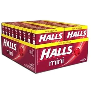 Caixa contendo 18 caixinhas da bala Halls sem açúcar de 15 gramas cada. Nos sabores Extra Forte, Cereja e Melancia.