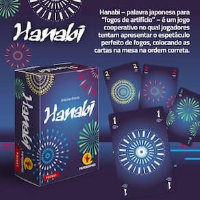 Hanabi Linha Hanabi - palavra japonesa para fogos de Artifício - é um jogo cooperativo no qual jogadores tentam apresentar o Espetáculo perfeito de fogos, colocando as cartas na mesa na ordem Correta. Parece fácil, certo Bem, nem tanto, pois neste jogo Você segura suas cartas de forma que elas fiquem visíveis apenas aos outros Jogadores. Isso mesmo, você não pode ver suas próprias cartas Vocês devem trabalhar em Time, dando dicas uns aos outros a respeito dos valores ou das cores das Cartas de cada um para criar um deslumbrante espetáculo de fogos antes que acabem Suas cartas. Além da arte totalmente Renovada, esta nova edição de Hanabi inclui 2 expansões Dentro da caixa: Avalanche de Cores e Pólvora Negra, que Acrescentam novos níveis de dificuldade nas partidas. Hanabi venceu o Spiel des Jahres de 2013, uma das principais premiações de jogos do mundo. Homologação Inmetro: IP-BRI-2312/2021-03 Marca: Não Informado Ean: 7898706770760