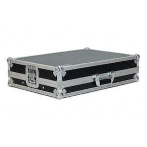Estrutura de 6 mm revestido em Laminado TX preta Perfil macho e fêmea de 6mm de alumínio para maior resistência Cantoneira em L nas laterias de 15 mm Acabamento interno em espuma de alta densidade de 10mm base de apoio do monitor vai sem furação para cliente furar conforme seu modelo 2 Fechos tipo borboleta cromado Cantos de metal cromado 1 Alça de metal externa