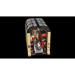 O modelo de trem inclui uma locomotiva e um vagão detalhados com recortes laterais para acesso às minifiguras, e o vagão possui espelhos em uma das extremidades para criar a ilusão de um trem mais longo.