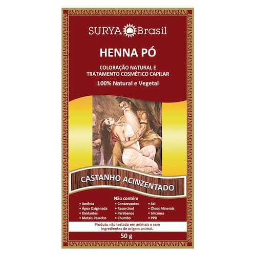 HENNA PÓ SURYA BRASIL CASTANHO ACINZENTADO Coloração natural e tratamento capilar 100% natural e vegetal. Não contém Água Oxigenada, Amônia, Metais pesados, PPD, Resorcinol ou Parabenos. Colore enquan