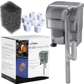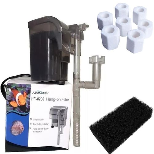 eleve a qualidade da água do seu aquário com o kit filtro externo hang on hf-200 da aquatank, que inclui tudo o que você precisa para manter um ambiente aquático saudável. O filtro externo hf-200 proporciona uma filtragem eficaz, removendo impurezas e mantendo a água cristalina. Complementando este desempenho, o refil de esponja e a mídia biológica, ambos específicos para o hf-200, garantem uma manutenção simples e eficiente. Mantenha seu aquário impecável e seus peixes felizes com este kit completo da aquatank. - bonito, prático e funcional com baixo custo. - para aquários de até 40 litros - filtro externo tipo hang on filter - extremamente silencioso, pode ser utilizado em aquários marinhos ou de água doce. - especificação: vazão máxima de 200l/h e potência de 3,5 watts. - precauções: conecte somente em rede elétrica conforme especificado no aparelho ou na embalagem. - não utilize fluídos inflamáveis ou água acima de 35 graus c. - manutenção: a manutenção periódica a cada 2 meses garantirá um funcionamento regular e vida longa ao filtro. - antes de iniciar a limpeza do filtro, desligue o filtro da rede elétrica e em seguida retire a água de dentro do filtro. Características: