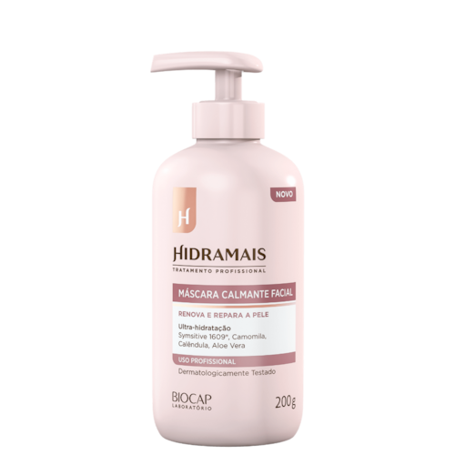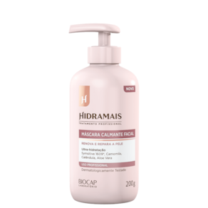 Máscara facial. Hidramais Calmante é recomendado para profissionais, promovendo a reparação, hidratação e acalmando a pele.