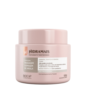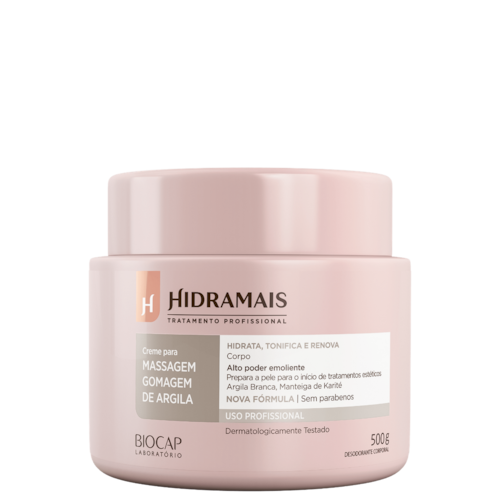Creme para massagem. Hidramais Gomagem de Argila Branca é recomendado para profissionais, sendo um ótimo aliado para o início de tratamentos estéticos.