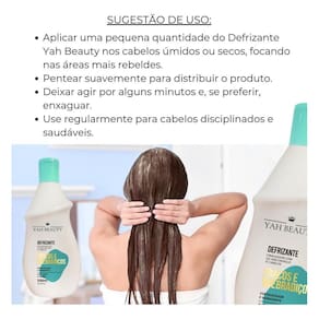 - aplique uma quantidade adequada do defrizante yah beauty nos cabelos úmidos ou secos, distribuindo uniformemente do comprimento às pontas.