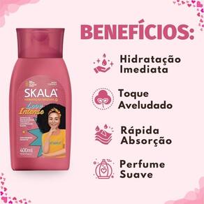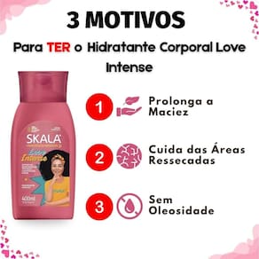 Com uma formulação vegana, livre de ingredientes de origem animal, e de rápida absorção, o Hidratante Skala Love Intense pode ser utilizado diariamente. Sua composição é cuidadosamente elaborada sem parabenos, triclosan, petrolatos, óleo mineral e corantes, minimizando riscos de alergias e promovendo um toque aveludado e duradouro, acompanhado de um perfume delicioso.