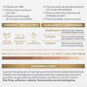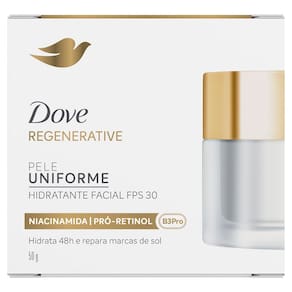 Hidratante Facial Dove FPS30 Regenerative Cada tom de pele é único. É por isso que a nova linha de cuidado facial de dpve trabalha com a biológia da sua pele para estimular a regeneração de dentro par