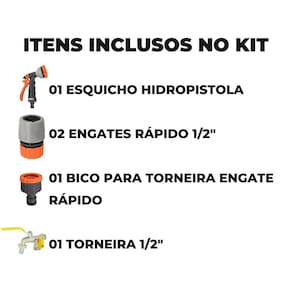 ITENS INCLUSOS 01 Torneira de Metal 1/2 e 3/4 01 Esguicho Hidropistola 6 Jatos Mangueira Jardim Para Engate Rápido 02 Engates Rápido 01 Bico Com Engate Rápido Para Torneiras de 3/4 + Adaptador para Torneiras de 1/2 Marca: Não Informado Ean: 7894141423773