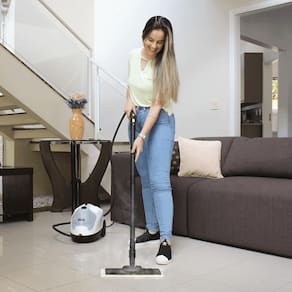 O higienizador a vapor SC 4 limpa sem produtos químicos, eliminando até 99,99% de vírus e bactérias. Com vapor contínuo e 2 reservatórios, é ideal para pisos, fogão, banheiros e estofados.
