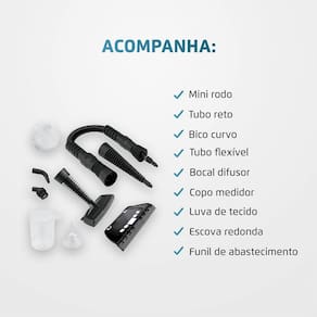 Itens inclusos - 01 Higienizador - 01 Tubo flexível - 01 Tubo reto - 01 Bocal difusor - 01 Mini-Rodo para vidro e superfícies lisas - 01 Escova redonda - 01 Bico curvo para cantos - 01 Copo medidor - 01 Funil de abastecimento - Luva de tecido para limpeza de estofados e roupas - Manual de Instruções