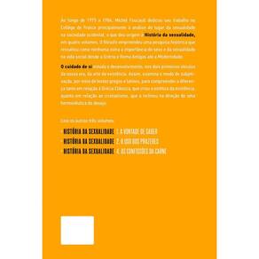 “História da sexualidade:O cuidado de si é um estudo da reflexão filosófica, moral e médica sobre os prazeres e a conduta sexual que retoma os mesmos temas de O uso dos prazeres: o cuidado com o corpo e com a saúde, a relação com a mulher e o casamento, com os rapazes, com a verdade.” - Roberto Machado Ean: 9788577534524