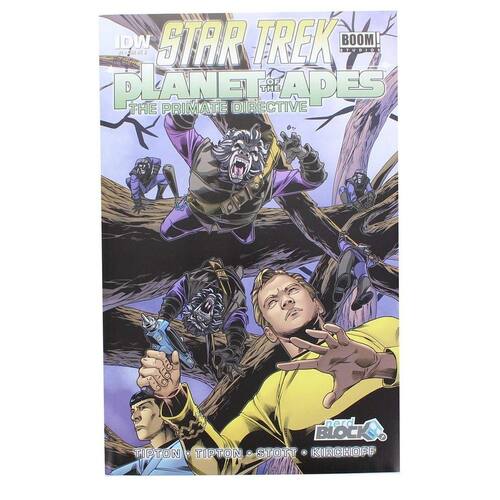 Co-publicado pela IDW e BOOM! , “Star Trek/Planet of the Apes: The Primate Directive” #1 combina os universos de duas das licenças mais queridas da cultura pop. Continuando com as versões das franquias dos anos 1960 e 70, respectivamente, esta série começa com o envio de membros da Enterprise disfarçados. Esta é a capa exclusiva da variante Nerd Block.