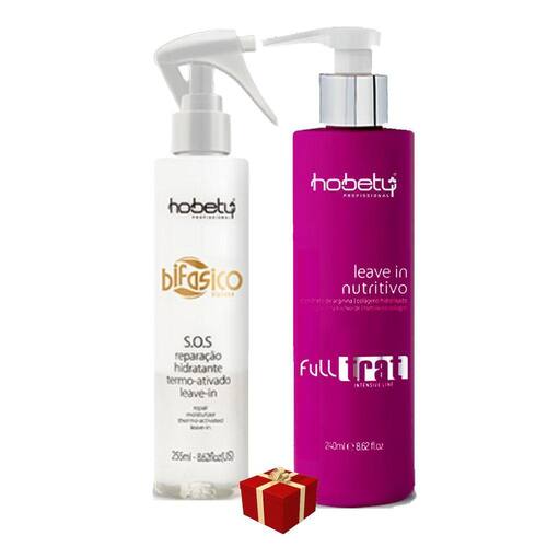 Hobety Full Trat Leave-in 240g + Bifásico Leave-in SOS 255ml Full trat leave-in nutritivo 240g Creme de pentear sem enxágue para finalização da hidratação. Contém filtro solar e atua como protetor térmico no uso de escova ou chapinha. Possui como ativos a ARGININA, que forma uma película externa bloqueando a entrada de resíduos de poeira, vento e poluição, e COLÁGENO, que trata de dentro para fora. O COLÁGENO alinha as cutículas, preenchendo os espaços vazios deixados pelo uso de químicas diversas, além de recuperar a elasticidade natural e o balanço dos cabelos. Ajuda a reter água nos fios, evitando a quebra e a queda e, principalmente, mantendo o efeito hidratado durante todo o dia.