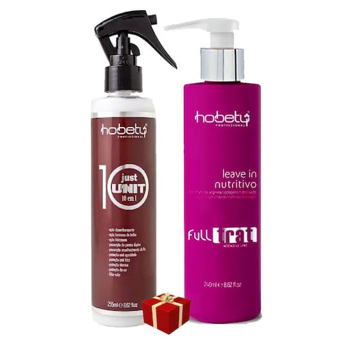 Hobety Full Trat Leave-in 240g + Just Unit 10em1 255ml Full trat leave-in nutritivo 240g Creme de pentear sem enxágue para finalização da hidratação. Contém filtro solar e atua como protetor térmico no uso de escova ou chapinha. Possui como ativos a ARGININA, que forma uma película externa bloqueando a entrada de resíduos de poeira, vento e poluição, e COLÁGENO, que trata de dentro para fora. O COLÁGENO alinha as cutículas, preenchendo os espaços vazios deixados pelo uso de químicas diversas, além de recuperar a elasticidade natural e o balanço dos cabelos. Ajuda a reter água nos fios, evitando a quebra e a queda e, principalmente, mantendo o efeito hidratado durante todo o dia.