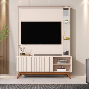 Compacto e sofisticado, comporta TVs de até 60 e traz 2 portas ripadas, prateleiras de vidro e espelho que ampliam o ambiente.