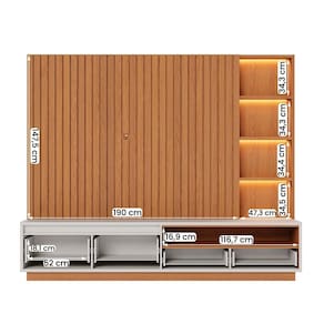 Adequado para TVs de até 82 polegadas, o home possui nichos decorativos com led, nicho inferior para aparelhos, duas gavetas com corrediças telescópicas e dois gavetões laterais, oferecendo uma solução completa para armazenamento.