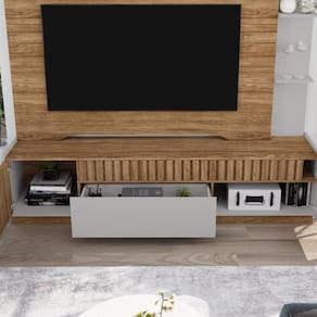 Home Dallas, uma misto de elegância e modernidade. Robusto, ele possui largura de 2,1 metros, é o móvel ideal para sua sala! Ele conta com detalhe decorativo ripado que se estende até sua porta, que possui dobradiças com sistema softclose e fecho clique magnético. Gaveta e Porta direita em MDF chanfrado que proporcionam o produto um design único. Ele possui corrediça telescópica reforçada. 3 Prateleiras sendo a superior em 25mm, amplo espaço para TV, comportando TVs de até 75 polegadas.