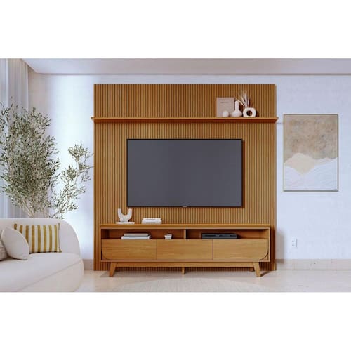 A Composição Luna combina design sofisticado e funcionalidade, sendo fabricada com uma estrutura em MDP e MDF, com chapas de 12, 15 e 25mm, que garantem resistência e durabilidade, e revestida com pintura UV de alta qualidade, que proporciona um acabamento impecável. Suas dimensões são de 2,380 x 2,445 x 0,185m para o painel e 2,000 x 0,625 x 0,360m para a bancada, oferecendo amplo espaço para acomodar TVs de até 75 polegadas. O painel apresenta um elegante frisado em MDF com design em baixo relevo, enquanto a bancada possui um tampo suspenso de 25mm com borda chanfrada, conferindo modernidade ao ambiente. Conta com três gavetas com corrediças telescópicas, sendo duas laterais com detalhes curvos que adicionam sofisticação e uma prateleira para organização adicional, além de pés usinados que garantem estabilidade e estilo. O espaço para TV é de 2,380 x 1,200mm no painel e 2,000 x 0,360m na bancada, suportando um peso total de até 45kg. O sistema de montagem Girofix facilita a instalação, tornando a Composição Luna a escolha ideal para transformar sua sala em um ambiente moderno e acolhedor.
