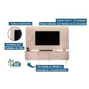 Tipo de Porta: - Portas de Bater Tipo de Corrediça: - Corrediças Metálicas Quantidade de Portas: - 2 Portas de Abrir Tipo de Iluminação: - Iluminação LED Tipo de Gaveta: - Gaveta Externa Quantidade de Gavetas: - 2 Gavetas Ideal para TVs até (Polegadas): - 75 Tipo dos Pés: - Pés Metálicos Quantidade de Pés: - Móvel possui 6 pés