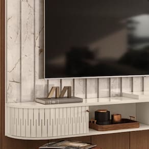 A bancada possui detalhes curvos no tampo e na base, painel com detalhes em paineis sobrepostos, alem do puxador em bronze que combina perfeitamente com seu design moderno. Otimiza o espaco da sala de estar e suporta TVs de ate 75, ele e uma solucao versatil que proporciona uma experiencia visual impactante e redefine os padroes de design de interior.