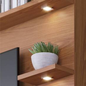 Possui um painel para TVs de até 70 polegadas, três prateleiras superiores iluminadas por spots de Led, nichos internos e uma gaveta com corrediças telescópicas. Tornando ele perfeito para organização de aparelhos eletrônicos e objetos decorativos