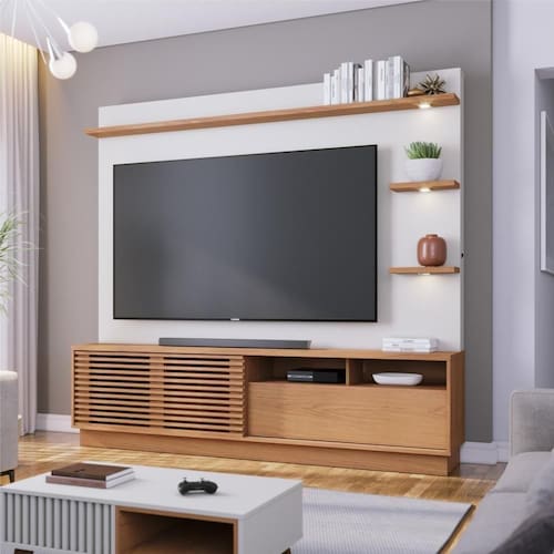 Possui um painel para TVs de até 70 polegadas, três prateleiras superiores iluminadas por spots de Led, nichos internos e uma gaveta com corrediças telescópicas. Tornando ele perfeito para organização de aparelhos eletrônicos e objetos decorativos