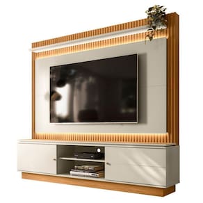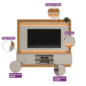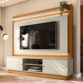 Conta com duas portas de correr com detalhes de frisos, dois puxadores de alumínio e duas prateleiras para dispor objetos decorativos e eletrônicos e ainda tampo com detalhe chanfrado. O painel ripado com fitas de led deixa a sua sala ainda mais atraente.