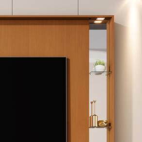 Prateleiras de vidro e detalhes com espelho luminária de LED;