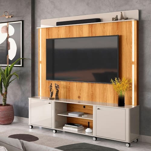 Feito em MDP. Possui 2 prateleiras, 2 portas e 8 pés em rodizíos facilitando o manuseio do produto.Tamanho de TV Suportado: Até 75