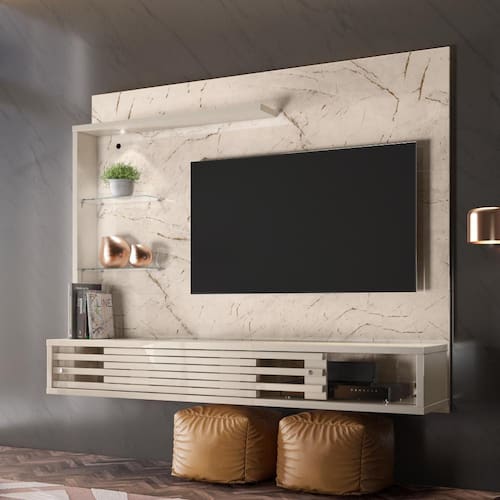 Feito para TVs até 50 polegadas, ele conta com 2 portas deslizantes e suas prateleiras de vidro trazem destaque aos seus objetos decorativos!
