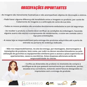 - Confira as dimensões do produto no momento da compra e certifique-se de que passará normalmente por elevadores, portas, escadas e/ou corredores, evitando assim futuros desagrados ou imprevistos com a entrega do produto.