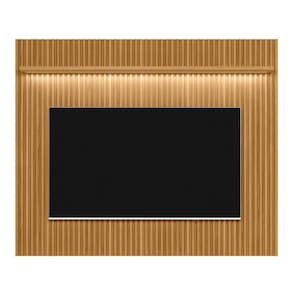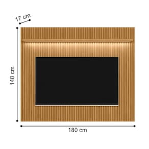 O painel possui detalhes ripados e na prateleira superior contém uma fita de LED trazendo mais sofisticação e elegância para o seu ambiente