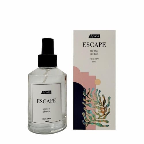 O Home Spray EscapeA\CASA possui aroma de Menta e Jasmin de 200ml com superfície incolor e formato arredondado. Possui tecnologia exclusiva para espalhar o aroma com maior duração e alcance da essência no ambiente.