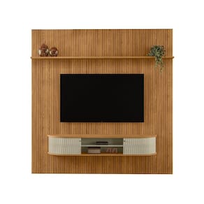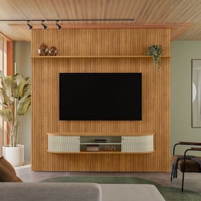 Características: Estrutura em MDP Pintura semi brilho Portas deslizantes em MDF Puxadores em Poliestireno Painel e bancada devem ser fixados na parede Tampo e base com detalhes curvos Espaço para TV até 75 Polegadas.