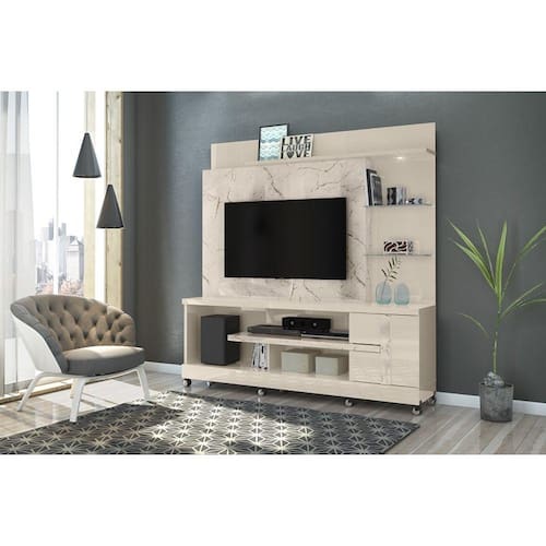Home Theater Alan para TV de até 55 polegadas COM RODÍZIO - CALACATA / OFF WHITE - Madetec   Procurando Home Theater para a sua sala de TV. Aqui voce encontra os o HHome Theater Alan da Madetec, projetado para acomodar televisor de até 55 polegadas tem como diferenciais: O Painéis em MDP de 15 e 40mm com pintura UV, portas com dobradiças metálicas, prateleiras de vidro 5mm para objetos decorativos, luminária de LED e sistema de fixação com girofix.   Dimensões do produto Montado: Largura: 181 cm Altura: 180 cm Profundidade: 39 cm   Características:Material produto: MDPRevestimento: Pintura UVPossui 1 PortasDobradiças metálicasPossui 2 prateleiras com vidroMini Sapata PlásticaPossui pésEntrada TV Largura 136 cm Altura 99 cm Profundidade 26 cm para 55 polegadasSistema de montagem: GirofixPeso total suportado: 50 kgPeso do produto: 71,20 KgQuantidade de Volumes: 02   Garantia: 3 meses   Montagem: Recomendamos que a montagem seja feita por um profissional. Recomendação de Limpeza: Utilize pano levemente úmido.   Observações: - Nos responsabilizamos pela entrega dos produtos até onde as rodovias alcançam, entregas fluviais ou aéreas devem ser cotadas a parte - As imagens são ilustrativas, não acompanham objetos de decoração - A montagem será de responsabilidade do comprador. Não nos responsabilizamos, no ato da entrega, por subir escadas/elevadores ou transporte por guincho em apartamentos. Eventuais despesas são de responsabilidade do comprador. - Confira as dimensões do produto e certifique-se de que passará normalmente por supostos elevadores, portas, escadas e/ou corredores de sua residência.