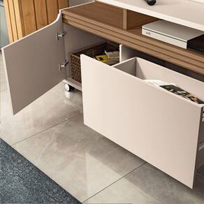 Home Theater Hb Móveis Quantum Para Tvs Off White/casta Eleve o estilo da sua sala de estar com o Home Theater Quantum, com design contemporaneo, que traz curvas sofisticadas e um visual moderno, perfeito para ambientes que pedem elegancia e funcionalidade. Projetado para TVs de ate 70, e a combinacao ideal de beleza e praticidade para quem busca o melhor em design e performance. O tampo com espessura de 25mm garante resistencia e robustez, enquanto o detalhe canelado na parte inferior adiciona um toque unico de charme, destacando ainda mais a sua composicao sofisticada. As 02 portas com dobradicas laterais de alta qualidade asseguram um fechamento perfeito, com um visual clean e moderno. Alem disso, a gaveta com corredicas telescopicas oferece maior suavidade e durabilidade no uso diario, ideal para guardar itens com facilidade e organizacao.