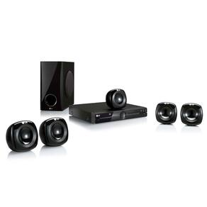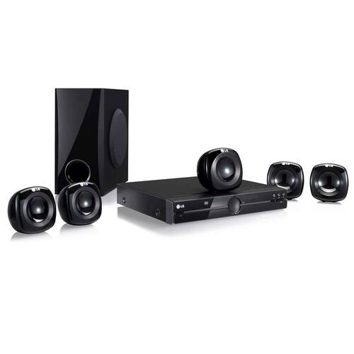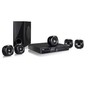 O home theater HT305SU da LG possui design reduzido e caixas acústicas tipo “parábola” com acabamento em black piano.