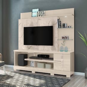 As dobradiças da porta são feitas de metal, material que transmite resistência e durabilidade ao móvel Acabamento: Pintura UV Acabamento da Porta: Pintura UV Acabamento da Prateleira: Vidro Acompanha Lâmpada: 01 Altura dos Pés: 6,5 cm Ambiente Principal: Sala de Estar Complexidade da Montagem: Média: pode ser montado por mais de uma pessoa e/ou necessite de maior conhecimento para montagem Cor: Calacata/Off White Cor do Produto: Calacata/off White Escala de Brilho: Semi-Brilho Escala de Brilho da Porta: Semi-Brilho Escala de Brilho da Prateleira: Não Possui Espessura do Vidro: 3 mm Ideal para TVs até (Polegadas): 55 Itens Inclusos: 1 manual de montagem Manual de Montagem e Instalação: https://product-hub-prd.madeiramadeira.com.br/935966/documents/630509b8-fdbb-4e96-8654-a748c001b044226874782617248491183277.pdf Material da Porta: MDP Material da Prateleira: Vidro Material do Puxador da Porta: Poliestireno Material dos Pés: MDP Material Principal: MDP Necessita Montagem: Sim Peso: 71,4 kg Peso Máximo por Prateleira: 5 kg Possui Espelho: Não Possui Possui iluminação: Sim Possui Pés: 08 Possui Portas: 01 Possui Prateleiras: 02 Possui Vidro: Sim Quantidade de Nichos: Não Recomendações de Uso, Manutenção e Limpeza: Para a limpeza utilizar um pano limpo e seco. Não limpar com produtos abrasivos ou escovas;Não deixar exposta à luz do sol diretamente pois isso irá diminuir a vida útil do produto;Este produto Não é recomendado Para ambientes externos onde possa receber chuva. Sapatas Niveladoras: Não Sistema de Montagem: girofix Tipo de Porta: Bater Tipo de Puxador da Porta: Externo