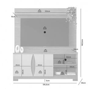 Detalhe ripado Portas usinadas com dobradiças de pressão Pés em ABS Nicho para eletrônicos Espaço TV: 1365mmx990mm(LxA) Acompanha suporte de TV OPCIONAL MONTAGEM SEM OS PÉS