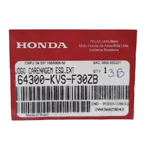 Descrição Técnica: Valor Unitário Produto: Carenagem Marca: Medidas: 28cm x 25cm x 20cm Peso: 1,000 Kg Part Number: 64300KVSJ00ZA Garantia: 3 Meses Data: 26/03/2025
