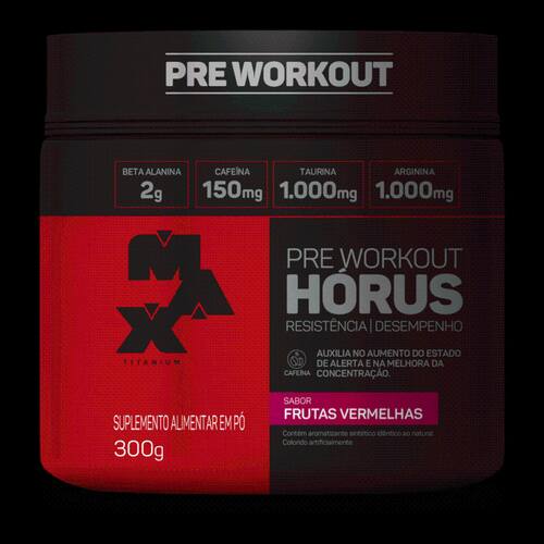 Informações do ProdutoPre Treino Horus Com Beta Alanina Max Titanium 300gHÓRUS é um produto para ser consumido no pré treino.Para quem se exercita com intensidade, a fadiga é um dos principais fatores que influenciam o rendimento, por isso desenvolvemos o HÓRUS: com formulação altamente tecnológica e ingredientes de altíssima qualidade, para você ter um treino com muito mais eficiênciaRecomendação de usoConsumir doses de 40mL ao longo do dia, com intervalo de duas horas entre as doses ou conforme orientação profissionalIngredientesIsomaltulose, beta-alanina, Larginina, taurina, cafeína, aromatizantes, edulcorante sucralose, antiumectante dióxido de silício e corantes artificiais indigotina e azul brilhante fcf.Não contem GlutenDestaquesBeta Alanina 2gTaurina 1.000mgArginina 1.000mgBenefíciosPre WorkoutResistênciaDesempenho
