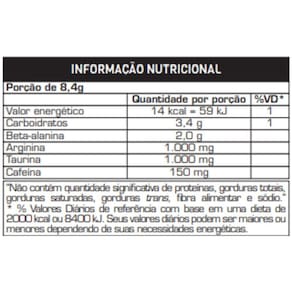 Isomaltulose, beta-alanina, L-arginina, taurina, cafeína, aromatizantes, edulcorante sucralose, antiumectante dióxido de silício e corantes artificiais indigotina e azul brilhante fcf.